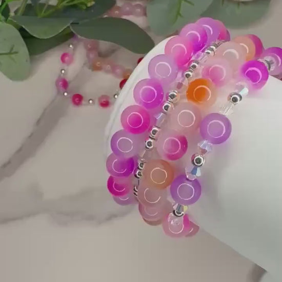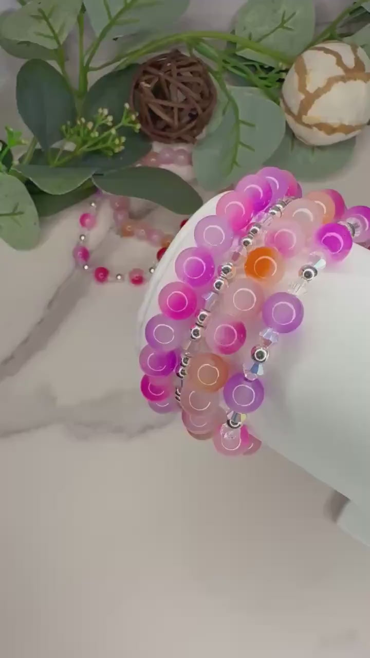 Each set includes four elastic string bracelets crafted from handmade glass beads in rich purples, pinks, and oranges. The fade resistant beads ensure lasting color and shine, while the strong prestretched elastic string offers durability and flexibility for comfortable all-day wear. Custom size bracelets are available to guarantee the perfect fit; please consult the size chart or contact us for personalized options.
